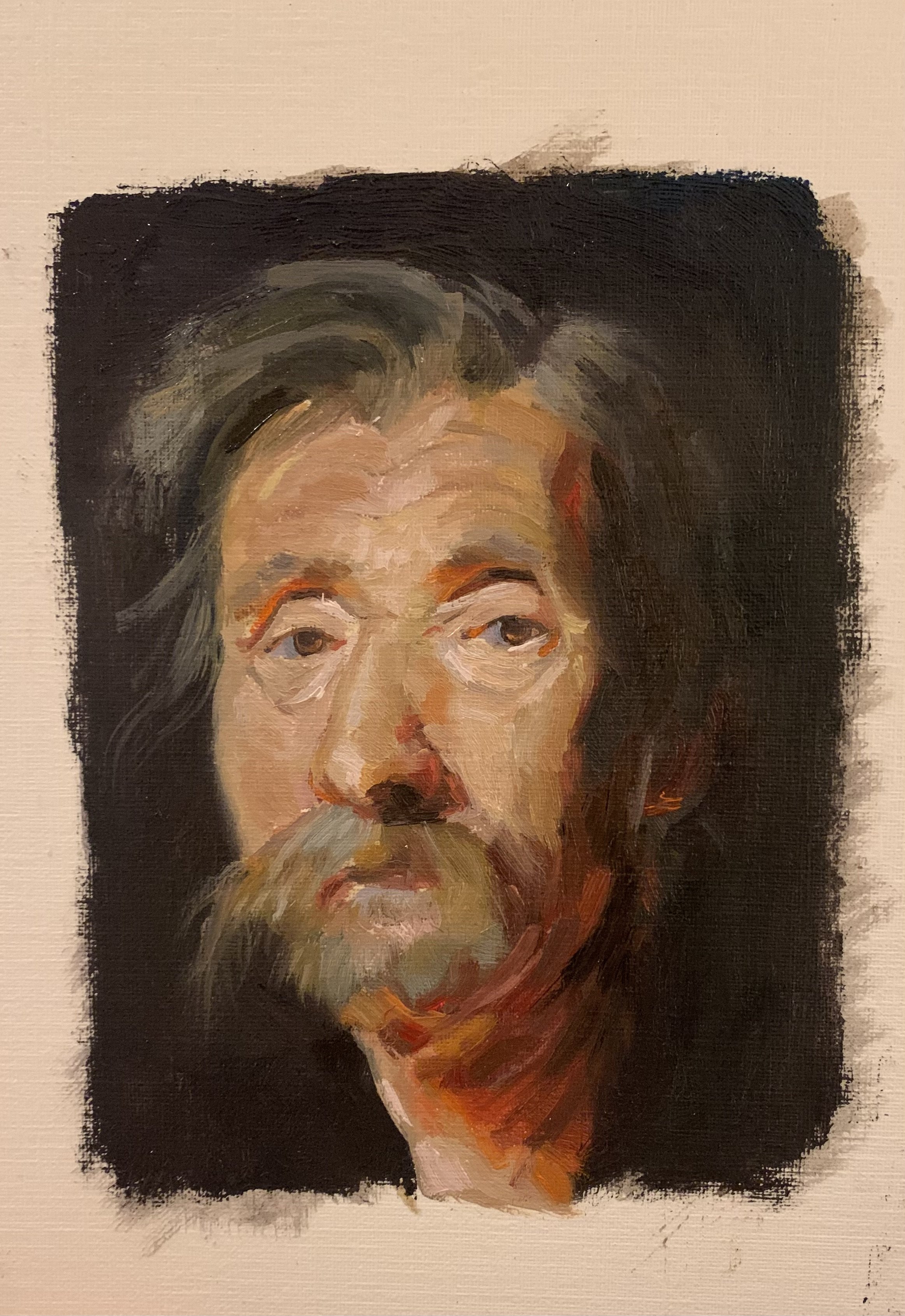 Painting of a man with a beard and brown hair, wearing a gray shirt, set against a purple background.