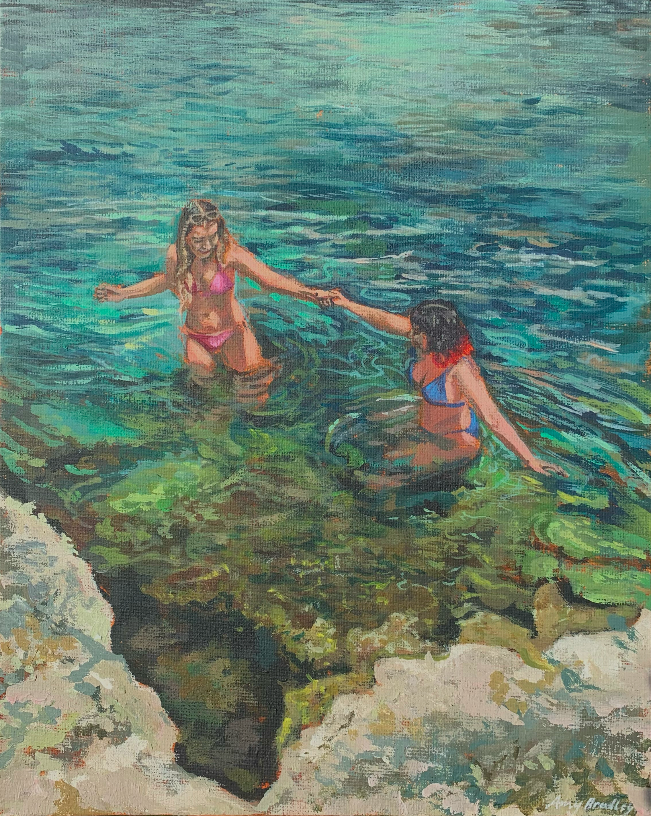 Two women in bikinis wading in clear blue-green water near rocky shore