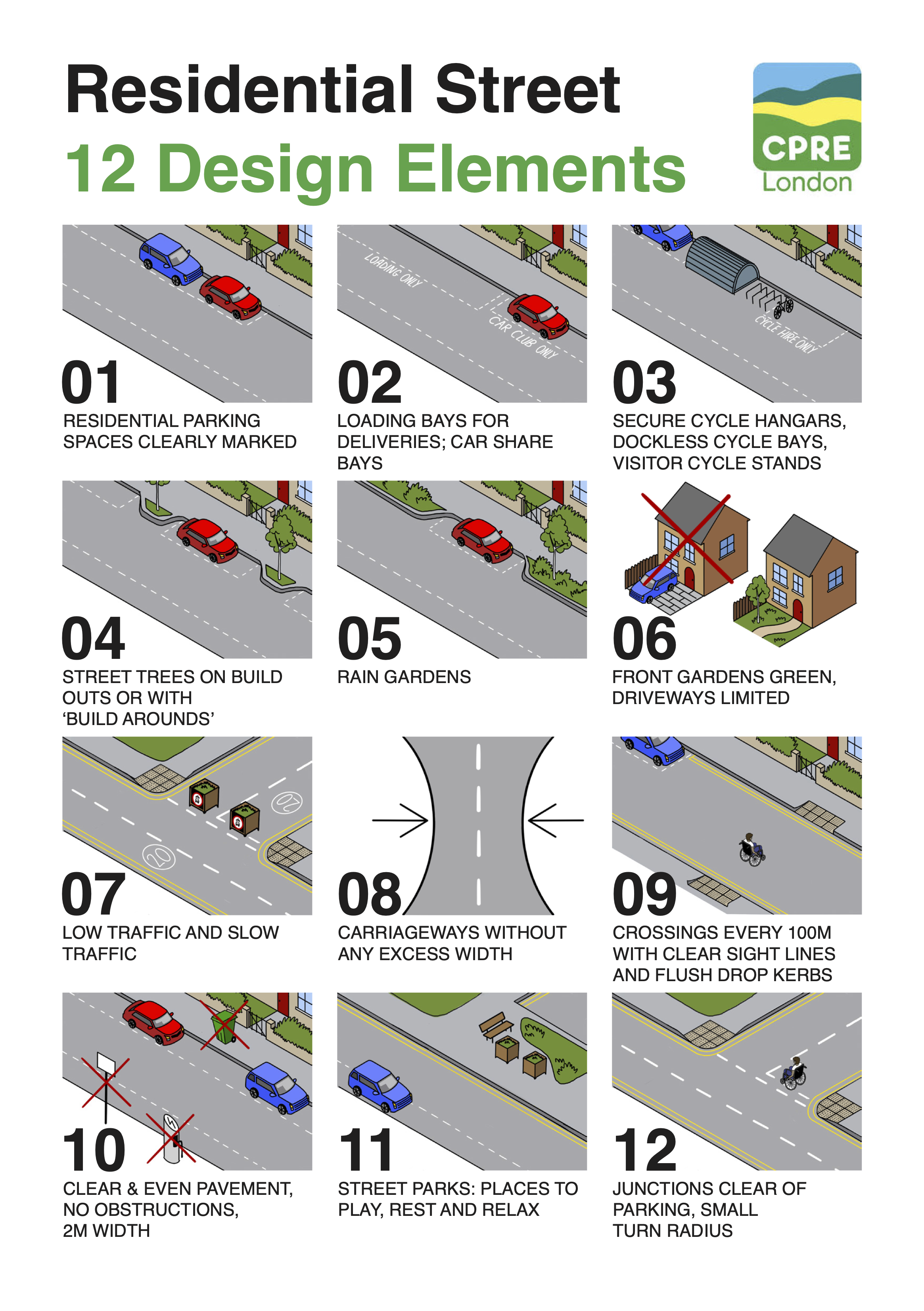 I worked with the CPRE London charity to create a flyer for the ‘Street Elements’ project, promoting safe and sustainable residential street design. The brief was to create simple, hand-drawn illustrations and to use a direct and clear layout design.